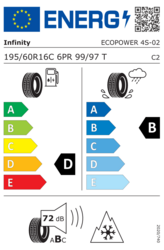 Infinity piedāvā Ecopower 4S, universālu riepu, kas ir izstrādāta, lai izciltu visos laika apstākļos. Šis visu gadu modelis izceļas ar spēju pielāgoties klimata izmaiņām, nodrošinot optimālu saķeri uz mitrām, sausām vai sniegotām virsmām. Tās gumijas specifiskais sastāvs, kas ir gan elastīgs, gan izturīgs, nodrošina uzticamu trakciju un vienmērīgu nodilumu, tādējādi pagarinot riepas mūža ilgumu. Ecopower 4S ir izstrādāts, lai atbilstu braucēju vajadzībām, kuri prasa pastāvīgu veiktspēju, nekompromitējot drošību. Tās progresīvais profils nodrošina lielisku vadāmību, savukārt pastiprinātā struktūra nodrošina labāku izturību pret grūtiem ceļa apstākļiem. Ar izcilu cenas un kvalitātes attiecību, Infinity Ecopower 4S ir ekonomiska risinājuma izvēle drošai un ērtai braukšanai visu gadu garumā.